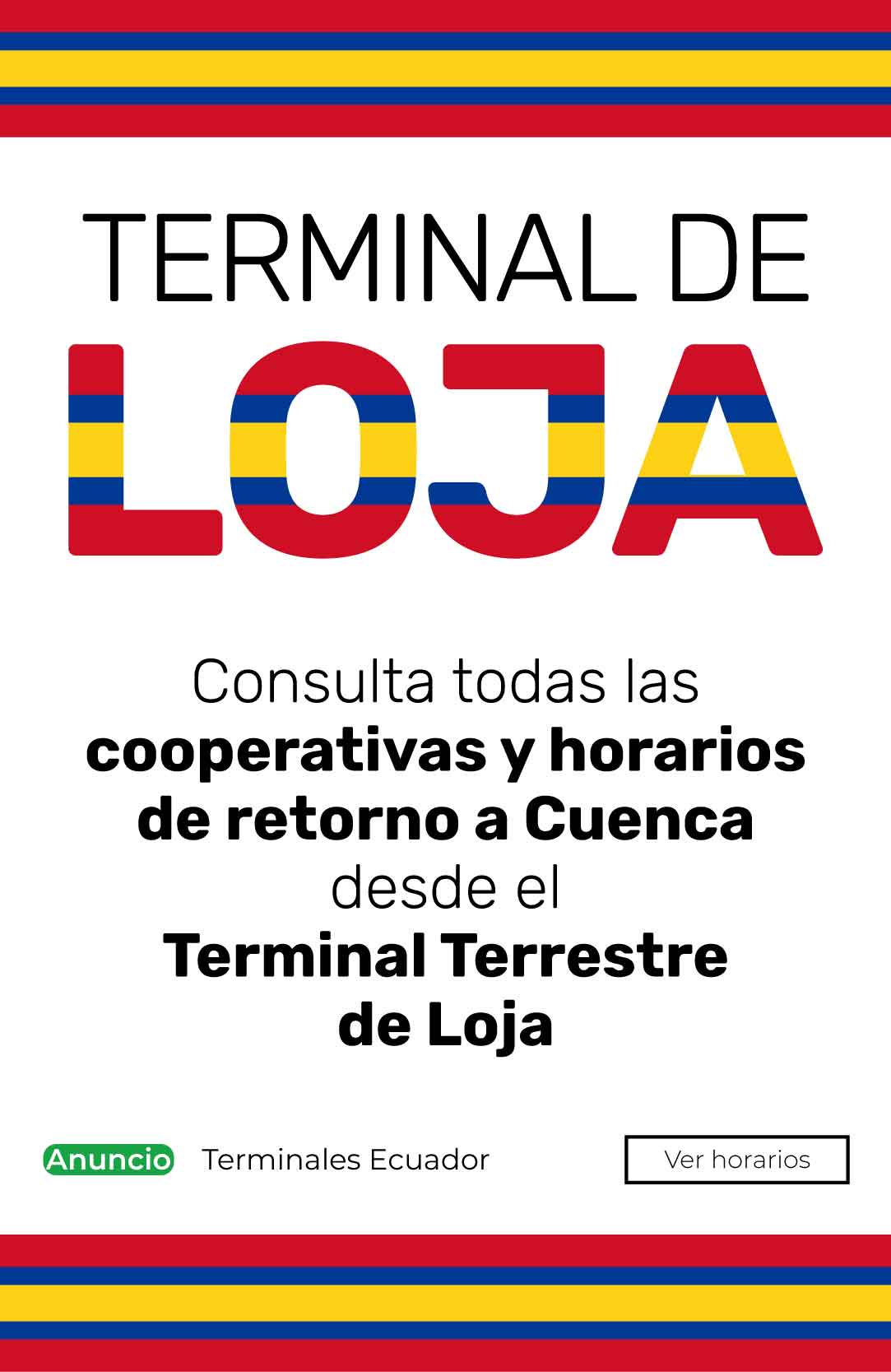 Explora la encantadora ciudad de Loja desde el Terminal Terrestre de Cuenca con nuestros horarios de viaje convenientes y accesibles. Con salidas regulares, te ofrecemos la oportunidad de sumergirte en la rica cultura, la historia fascinante y la belleza natural de esta joya del sur de Ecuador. Conocida como la "Ciudad de la Música", Loja te espera con sus festivales musicales, su arquitectura colonial y sus impresionantes paisajes montañosos. Nuestros horarios están diseñados para adaptarse a tus planes de viaje, ya sea que estés buscando una escapada de fin de semana o unas vacaciones más largas. No pierdas la oportunidad de descubrir todo lo que Loja tiene para ofrecer: reserva tu viaje hoy mismo y comienza una experiencia inolvidable en la provincia de Loja.